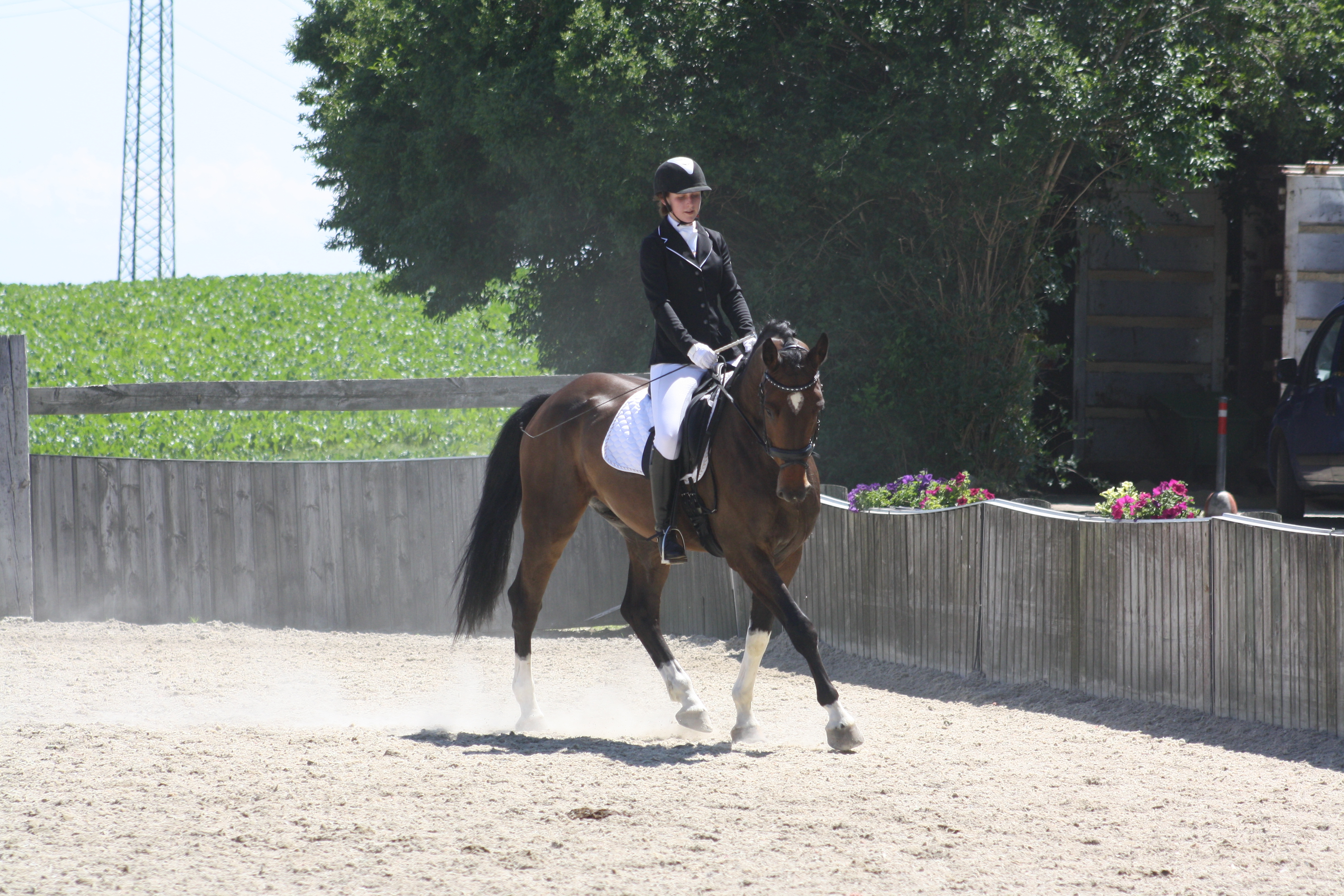 Elis gewinnt die höchste Prüfung des Turniers, die LM, mit einer Wertnote von 7,2; Claudia wird bei ihrem ersten Start auf einem Dressurturnier in der Dressurreiter-A Dritte und ist auch in der Klasse A platziert. Martina kann die Klasse Lizenzfrei einmal mit einer Note von 7,2 für sich entscheiden und ist in der anderen Lizenzfrei platziert und auch Verena kann auf einen Platzierungsrang reiten, beide mit jungen Pferden, die ihre ersten Auswärtserfahrungen sammeln!